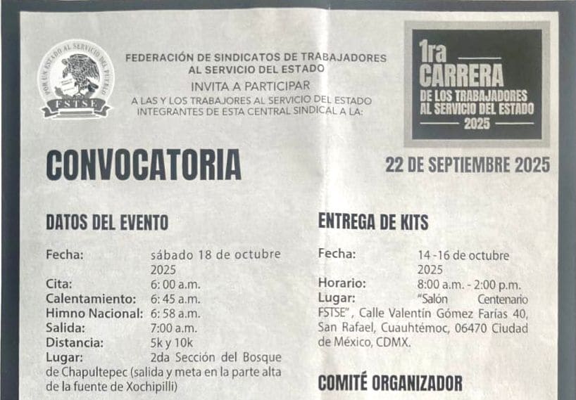 Asimismo se detalla que la entrega de los Kits Deportivos (número, playera y gorra) será del 14 al 16 de octubre, de 8 a 14 horas en el Salón Centenario de la FSTSE, ubicado en la calle Valentín Gómez Farías 40, colonia San Rafael, sede nacional de esa Federación.